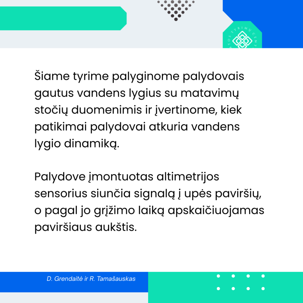 Šiame tyrime palyginome palydovais gautus vandens lygius su matavimų stočių duomenimis ir įvertinome, kiek patikimai palydovai atkuria vandens lygio dinamiką.