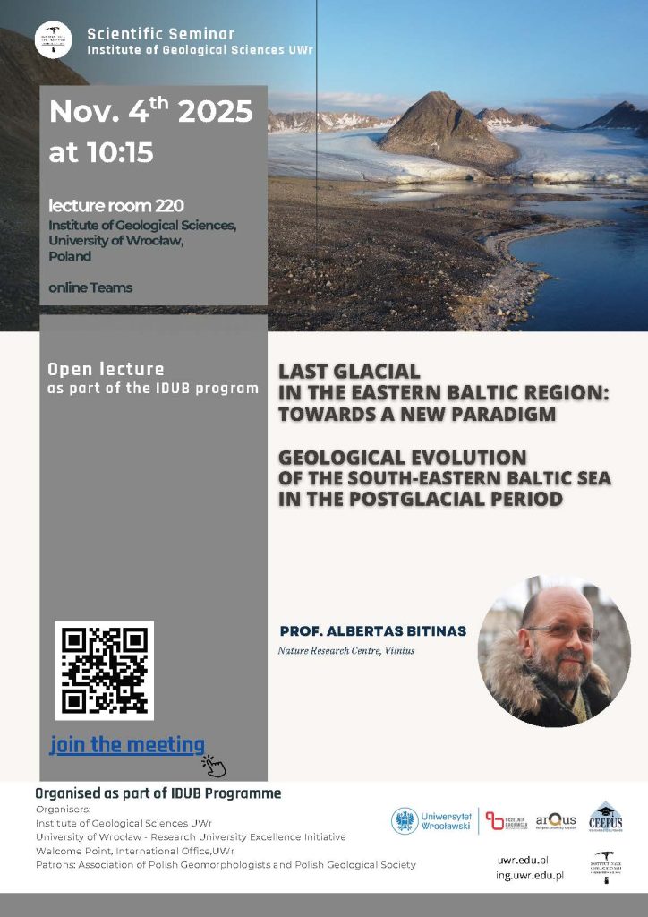 On November 3-7 this year, Chief Researcher at the GTC Quaternary Research Laboratory Prof. Dr. Albertas Bitinas, visited the Institute of Geological Sciences at the University of Wrocław in Poland. During the visit he gave two open lectures to the university’s scientific staff and students, as well as to members of the Polish Geological Society and the Polish Geomorphological Association who joined remotely: