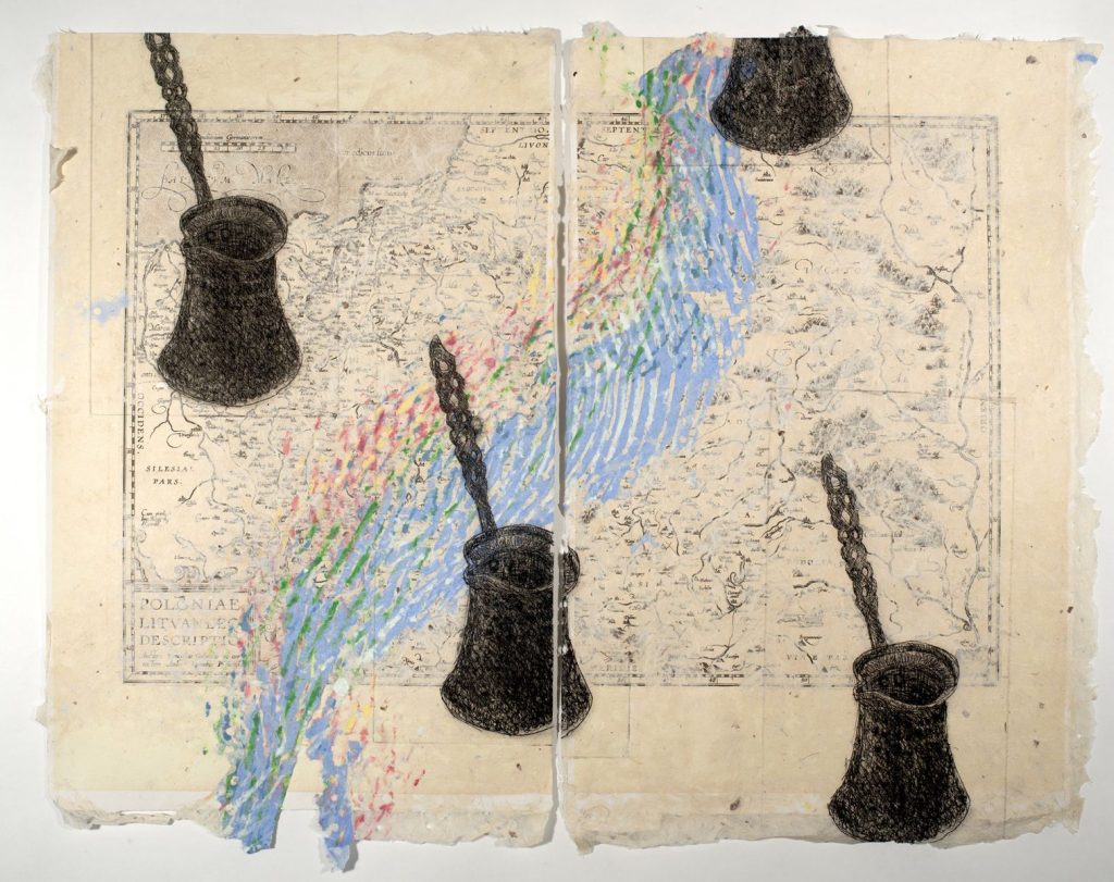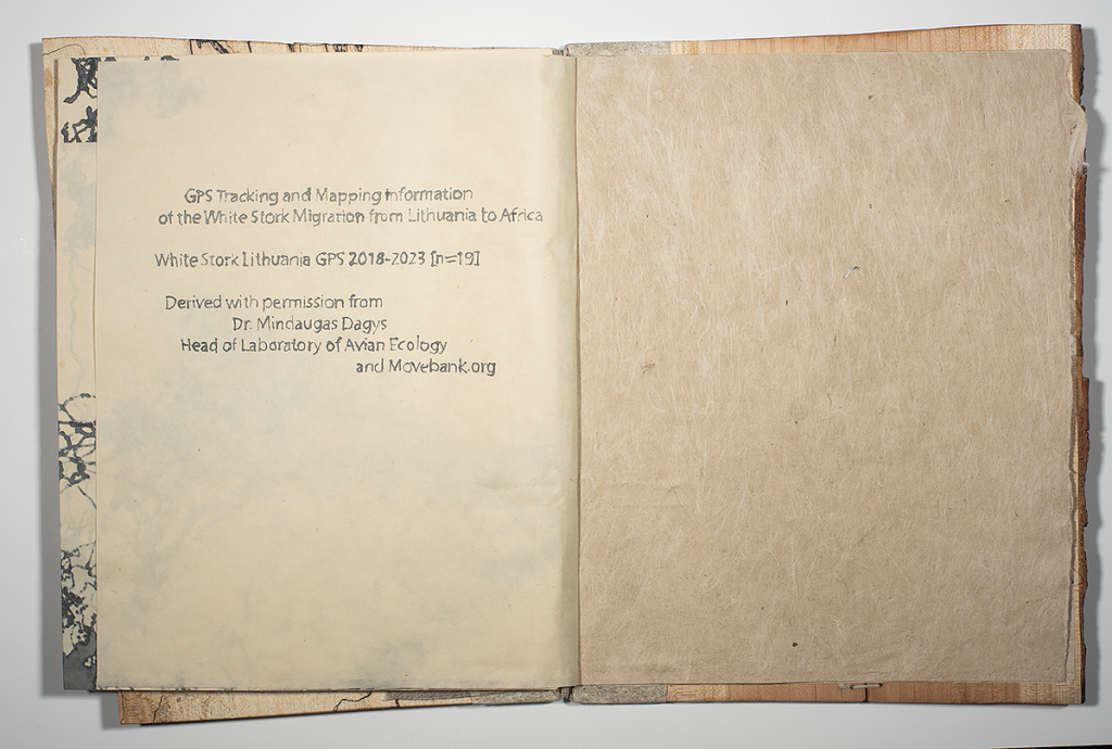 Cartographic images based on scientific data from NRC constitute an important highlight of the exhibition. Dr Mindaugas Dagys, Head of the Laboratory of Bird Ecology, provided access to White Stork migration tracking data collected on the Movebank platform. These scientifically based maps will become part of an artistic interpretation conveying migration processes in graphic works and in the artist’s books.