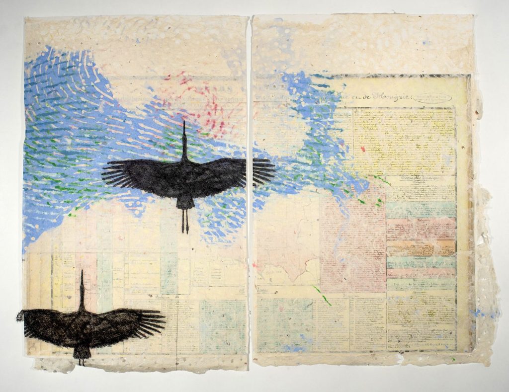 The works created for this exhibition include graphic prints and artist’s books exploring bird migration. They focus on the White Stork, Lithuania’s national bird, and its long journey to South and Central Africa.