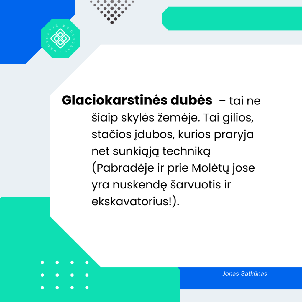 Glaciokarstinės dubės – jaunos, stačiašlaitės, gilios reljefo įdubos, paplitusios paskutiniojo apledėjimo Baltijos moreninėje aukštumoje, jų nėra kituose Lietuvos regionuose. Tipiška glaciokarstinė dubė – 40 m gylio Velnio duobė Aukštadvario regioniniame parke. Jos gali būti sausos, iš dalies užpildytos nuosėdomis arba būti ežerų dubenimis. Gilios dubės su paviršiuje plūduriuojančia augaline danga ir iš dalies užpildytos nekonsoliduotomis nuosėdomis – tai tikri spąstai sunkiajai technikai, ką liudija tragiškai nuskendusi karinė sunkiasvorė technika Pabradės poligone ar nuskendęs ekskavatorius su 12 m strėle prie Molėtų. Todėl yra svarbu praktiškai žinoti tokių reljefo formų gylius, formas, nuosėdų sudėtį.