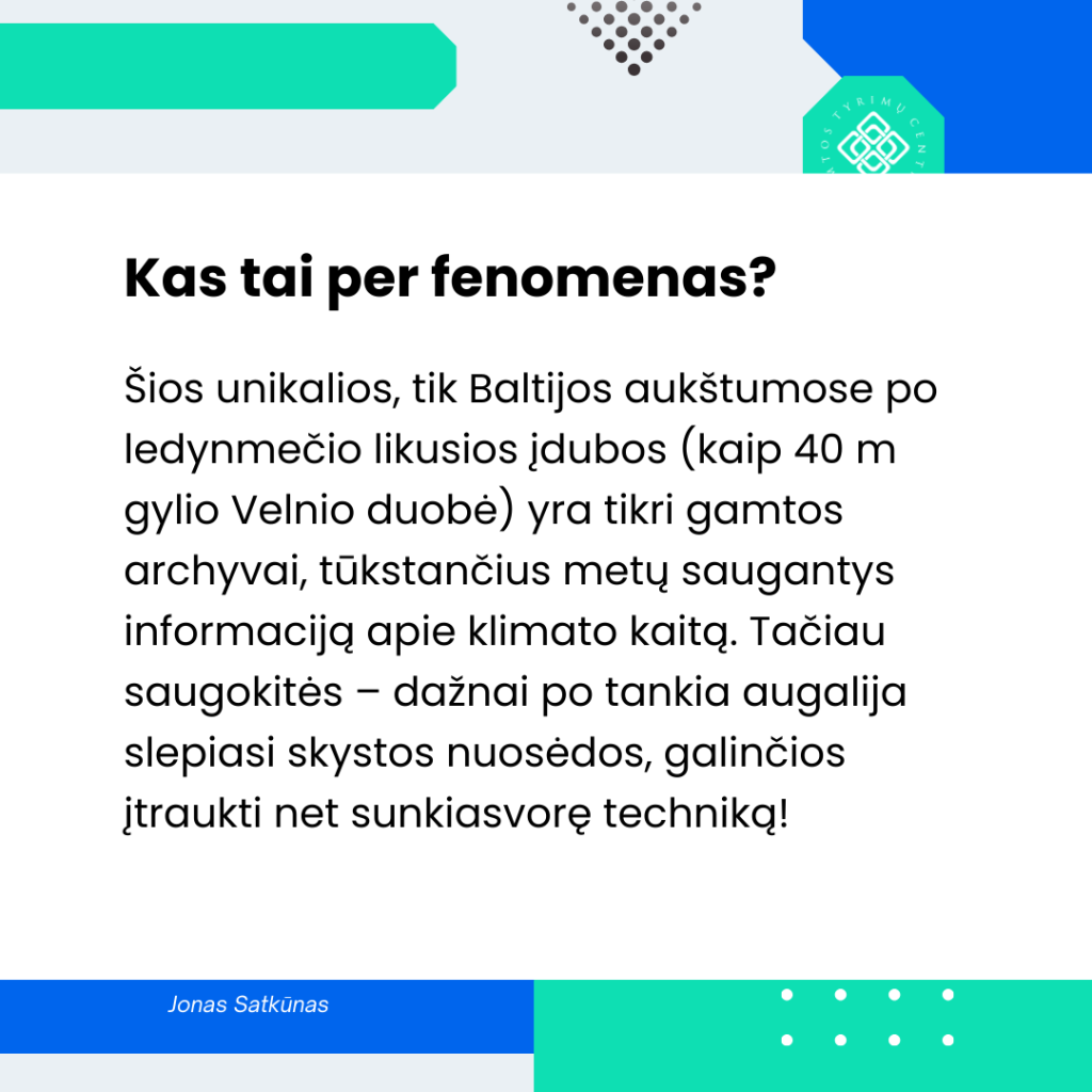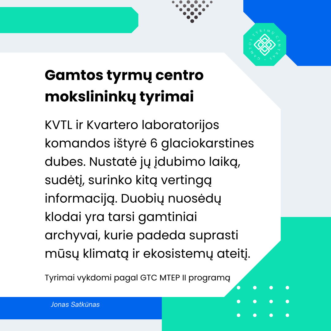 Klimato ir vandens tyrimų laboratorijos darbuotojai kartu su kolegomis iš Kvartero tyrimų laboratorijos ištyrė 6 glaciokarstines dubes Aukštadvario regioniniame parke ir vieną Molėtų rajone, nustatė jų formavimosi (įdubimo) laiką, užpildančių nuosėdų sudėtį, stratifikaciją, litologinę ir cheminę sudėtį, paleogeografines sąlygas, dubių morfometriją. Nustatyta, kad dubių nuosėdų klodai yra svarbus paleogeografijos ir klimato pokyčių duomenų šaltinis, tai – tarsi gamtiniai archyvai. Tyrimai vykdomi pagal Gamtos tyrimų centro MTEP II programą „Klimato kaitos ir žmogaus veiklos sąlygojamų veiksnių poveikiai ekosistemų būklei, jų funkcionavimui, teikiamoms paslaugoms ir išteklių tvarumui“ (Klimatas ir ekosistemos).