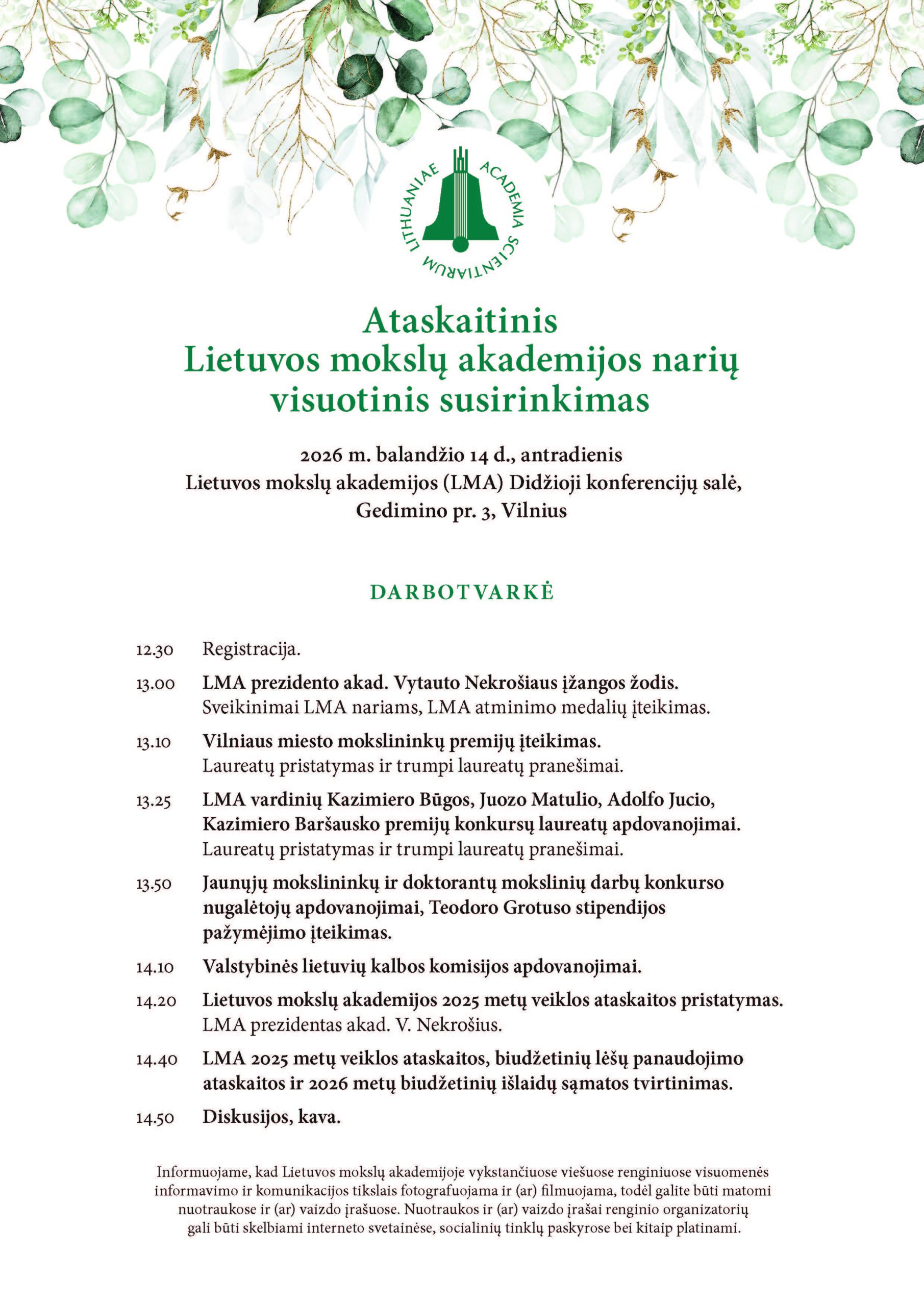 Pagyrimo raštas dr. A. Baranauskaitei-Lengvinienei bus iškilmingai įteiktas ataskaitiniame Lietuvos mokslų akademijos narių visuotiniame susirinkime, kuris vyks: