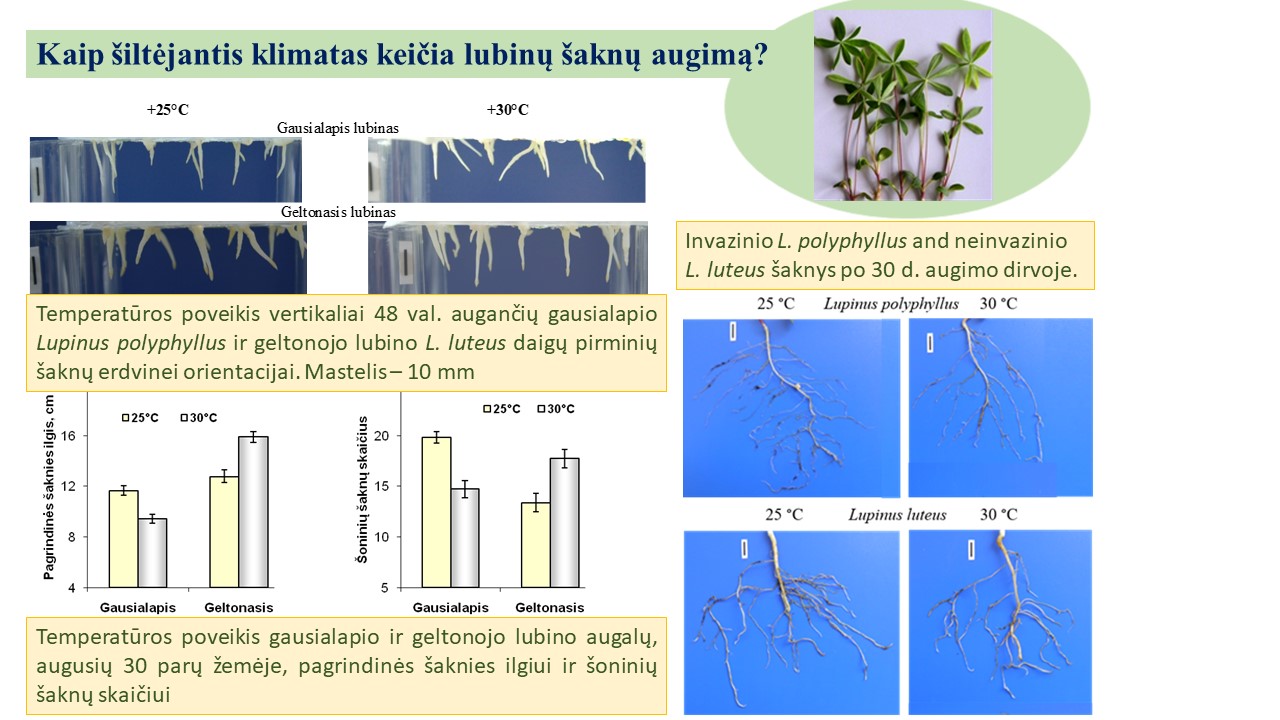 Vis sparčiau šylantis klimatas daro įtaką ne tik mūsų aplinkai, bet ir augalų augimui ir vystymuisi. Atlikti tyrimai atskleidė, kaip pakilusi temperatūra veikia dviejų rūšių lubinų – invazinio gausialapio lubino (Lupinus polyphyllus) ir neinvazinio geltonojo lubino (Lupinus luteus) – šaknų formavimąsi ankstyvose ir vėlesnėse augimo stadijose. Lubinai buvo auginti klimato kamerose, esant įprastai 25 ℃ ir padidintai 30 ℃ temperatūrai. Mokslininkai stebėjo, kaip keičiasi šaknų kryptis gravitacijos atžvilgiu, kaip greitai auga šaknys ir kaip formuojasi šaknų sistema per 2, 7 ir 30 dienų.